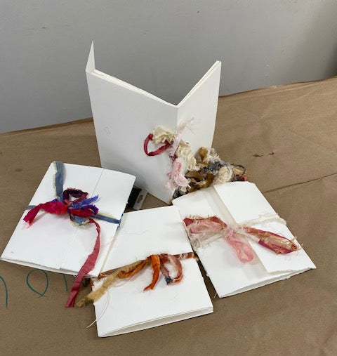 Mixed Media Art Journaling at ArticulationsIn this first class we started out by making our own journals. Getting to know one another and doing our first journaling prompt. Thank you to Journaler S for sharing Sari Silks and yarns for our bindings.